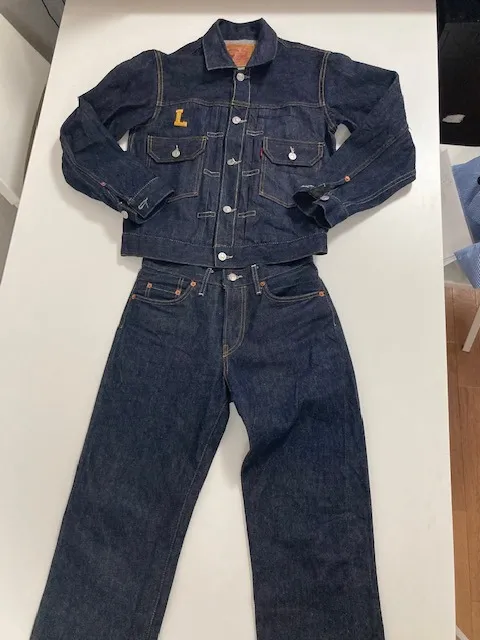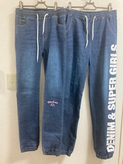 ストレッチデニム2型のオリジナル生産OEMの小ロット製造です。1本はスキニータイプで刺繍入り1本は裾ゴムでワイドタイプの脇にプリント英字膝部分にブラスト加工良く伸びるストレッチデニム素材ではきや…